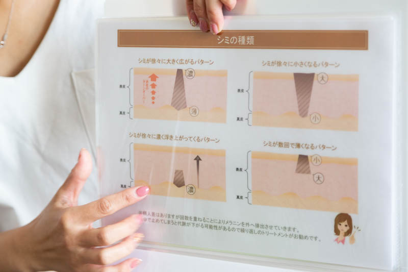 「シミには深さ・濃さ・幅など様々なものがあり、お客様の本来お持ちの代謝(ターンオーバーの力)でケアします。」