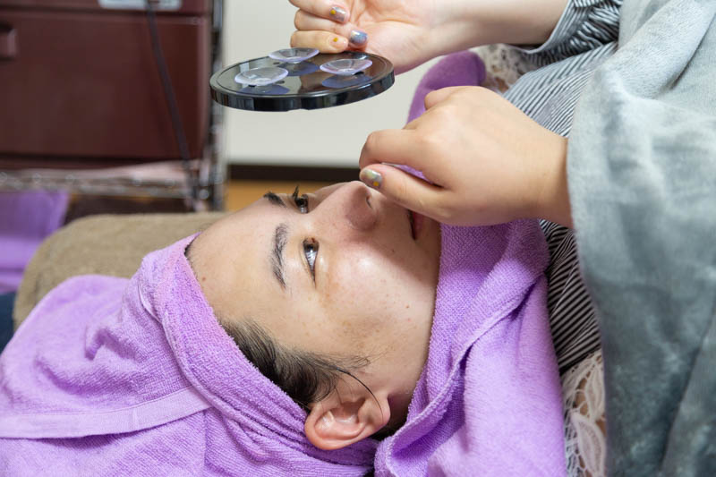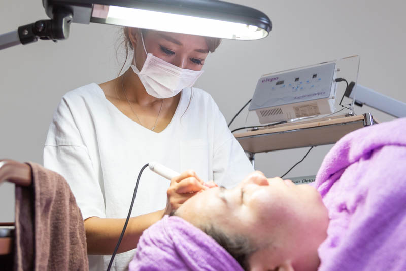 「シミケアにはお肌に負担の少ない低周波を使った施術をします。施術直後はホクロのようなカサブタのような黒い点になりますが、お肌の代謝とともに剥がれ落ちてくれるので安心してくださいね。」