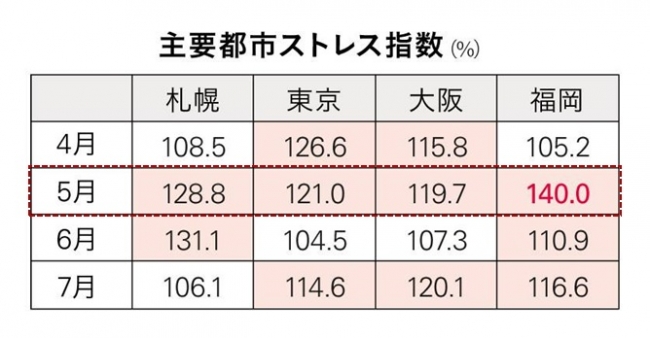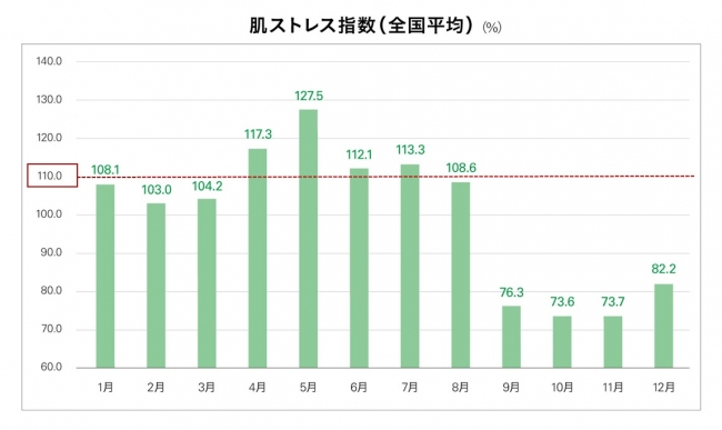 肌ストレス指数を数値化し全国平均を算出したところ、最も高い時期(110%を超える)が4月~7月という結果に。中でも5月が、127.5%と最高値となりました。