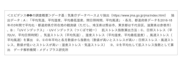 株式会社メディプラス(本社:東京都渋谷区、代表取締役社長:鈴木敬)は、気象庁データベース(日照、湿度、気温、風速)を基に肌にとって最もストレスがある時期について調査し、傾向を分析しました。