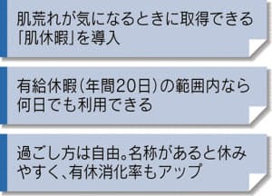 肌休暇は特別な追加の休みではなく、有給休暇の一環だ。有休の日数のなかなら何日でも取得できる。社員に肌をきれいに保ってもらうだけでなく「『肌休暇』と銘打つことで、有休の取得を推奨する意味合いもある」(人事部の寺内由紀恵課長)という。