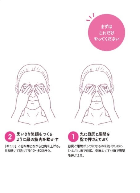 2 「ギュッ」と目を閉じながら口角を上げる。目を開いて閉じてを10〜30回行う。
