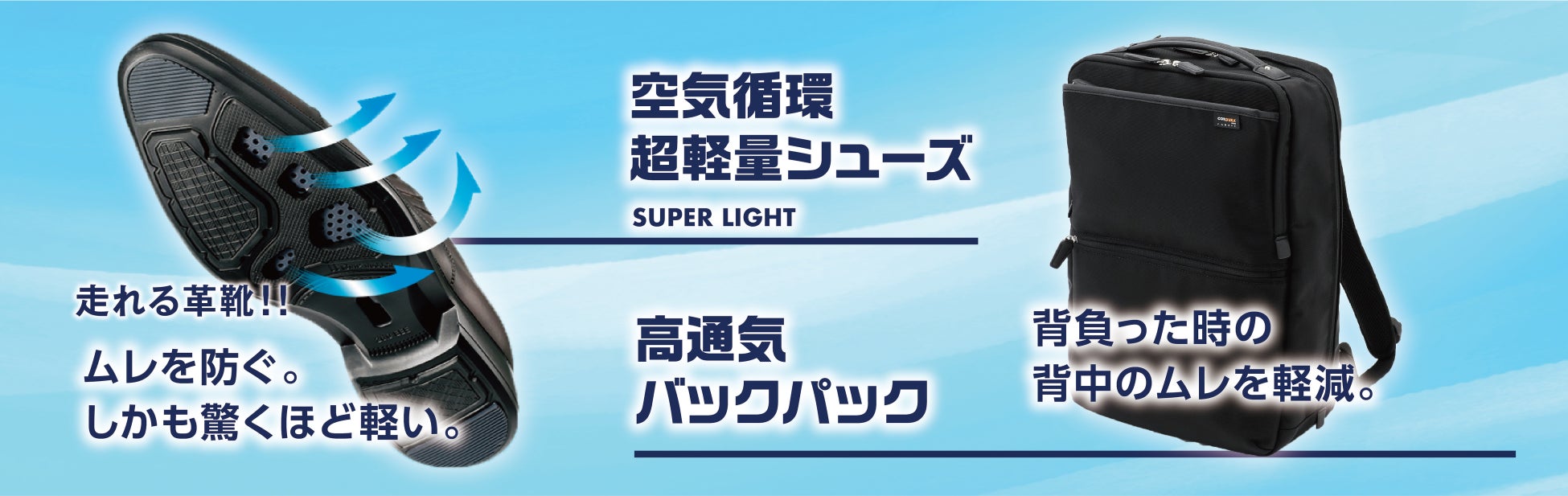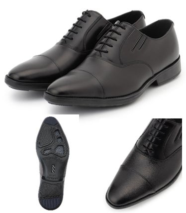梅雨から夏にかけておすすめのシューズは、インソールにもアウトソールにもメッシュ素材を使用し、高通気性を実現した「空気循環超軽量シューズ(走れる革靴)」です。雨の日でもお召いただけるよう、アウトソールのメッシュには透湿防水フィルムを施すことで、浸水しにくくなっています。加えて、片足の重さは約285gと、ランニングシューズの重さ(一般的な重さは約150g~350g)と同様の軽さを実現。さらに、履き口はサイドゴム仕様を採用し、着脱がらくちんな他、ダブルクッション仕様でスニーカーのような履き心地で、歩くことの多いビジネスパーソンには嬉しい機能性を盛り込みました。