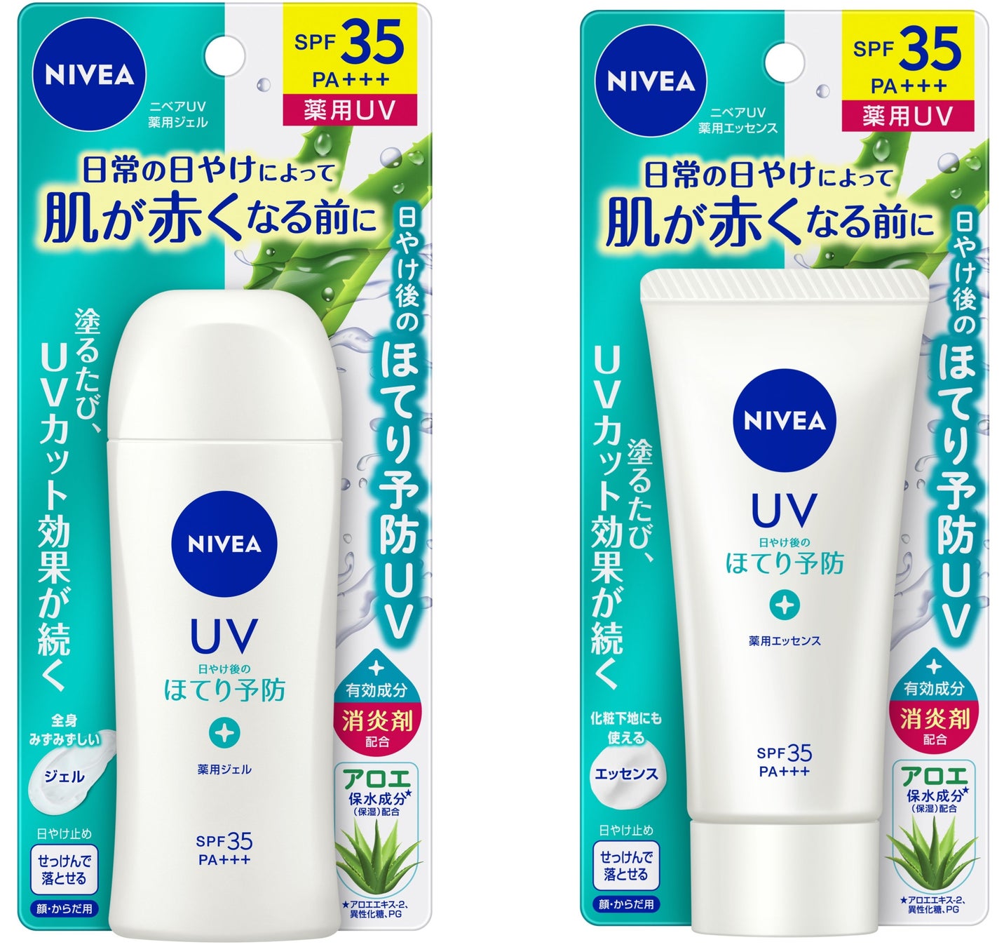 この度発売する『ニベア UV 薬用ジェル/薬用エッセンス』【医薬部外品】は、消炎剤(有効成分)配合で、日やけ後のほてりを防ぐ、薬用の日焼け止めです。紫外線防御効果はSPF35/PA+++で、日常使いとしてもおすすめです。また、紫外線などにより乾燥しがちな肌のために、保湿成分としてアロエ保水成分(*1)を配合しました。肌にうるおいを与えて乾燥を防ぎます。ボディケア品並みの保湿力で、ベタつかず、のびがよく全身にサッと塗り伸ばせる軽いつけ心地です。気分やすらぐフローラルハーブの香りとひんやり感のある剤で、さわやかな使用感です。