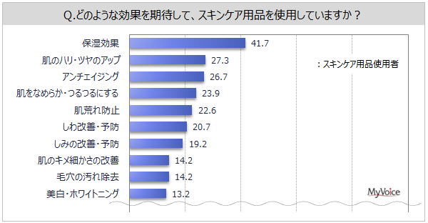 スキンケア用品使用者が、スキンケア用品に期待する効果は(複数回答)、「保湿効果」が41.7%、「肌のハリ・ツヤのアップ」「アンチエイジング」「肌をなめらか・つるつるにする」「肌荒れ防止」「しわ改善・予防」が各20%台です。