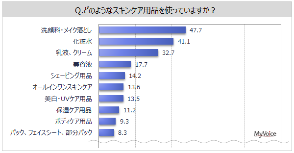 使用しているスキンケア用品は(複数回答)、女性では「洗顔料・メイク落とし」「化粧水」が8~9割です。男性では「洗顔料・メイク落とし」が10~40代で各30%台、「化粧水」が30代で3割強とやや高くなっています。