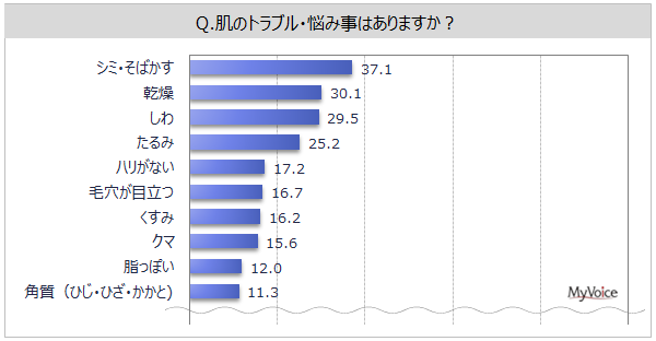 ■肌のトラブル・悩み事は「シミ・そばかす」「乾燥」が各30%台、「しわ」「たるみ」が各20%台、「ハリがない」「毛穴が目立つ」が各2割弱
